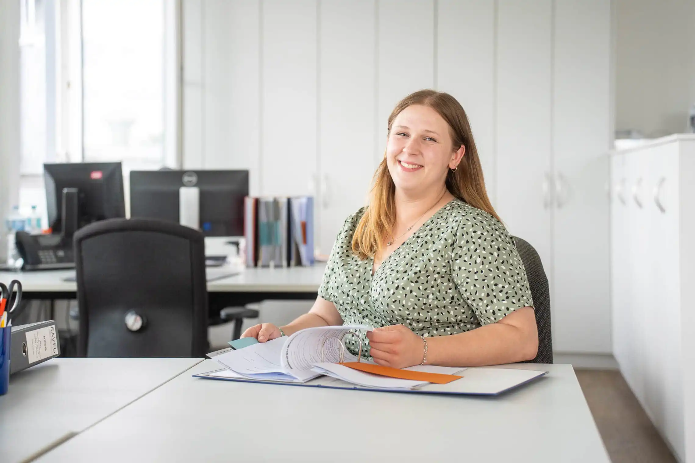 Die Person sitzt am Schreibtisch, steht an der Maschine, berät einen Kunden. Das Bild zeigt nicht nur ein Gesicht, sondern eine Tätigkeit. Der Betrachter versteht sofort: Das ist die Buchhalterin. Das ist der Werkstattleiter.